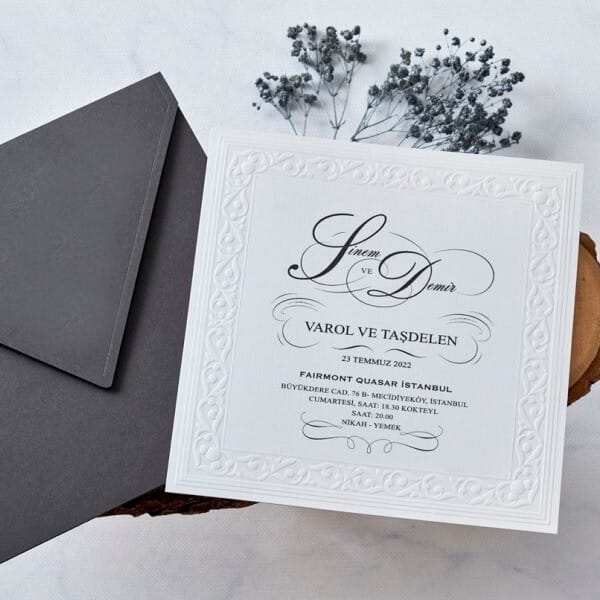 Kare gri zarflı ve sade iç kartlı düğün kartı.