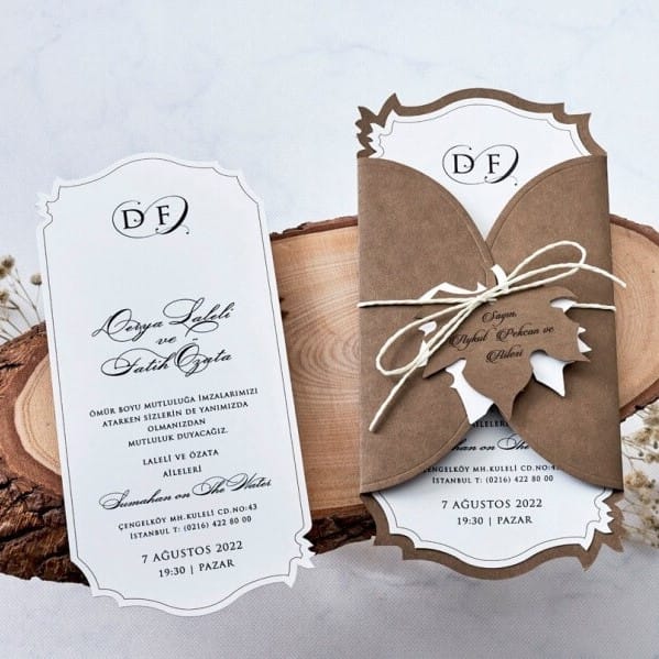 Davetiye özel zarflıdır. Zarfı kesimli, haki renkli olup iç kart yine zarfa uygun kesimi ile beyazdır.